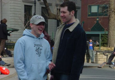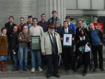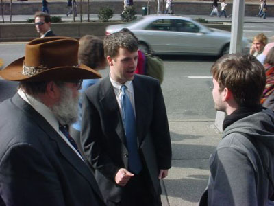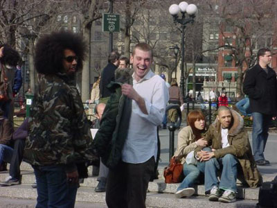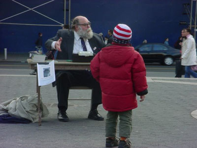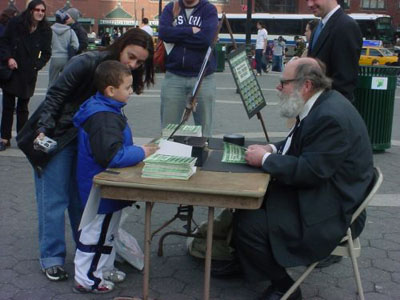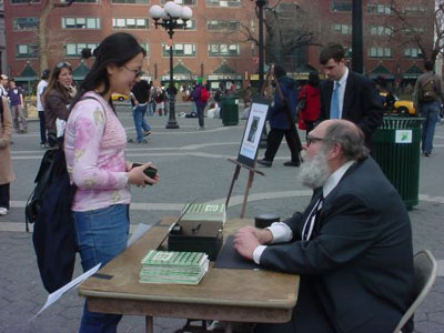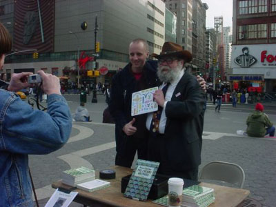 The guy selling Jesus refrigerator magnets in that picture is Normal Bob Smith, of normalbobsmith.com . He’s a viciously funny atheist who pulls all manner of crazy stunts, like dressing up like Satan and leading a group of Catholic school girls around the city. A meeting of the minds, to be sure.