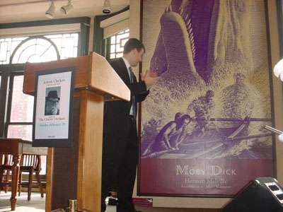 I decided to take Agent White’s “Meet Anton Chekov” pitch one step further, and stage a reading by Chekov, pretending to be a part of the Barnes and Noble “Meet the Writers” series. After staking out several downtown Barnes and Noble locations, I chose Union Square as our target. The “Meet the Writers” area on the fourth floor was the perfect setting. It features a large stage with podium in front of a seating area with around 150 seats. Customers tend to sit in the area and read quietly when there is no presentation happening; we would have a captive audience.