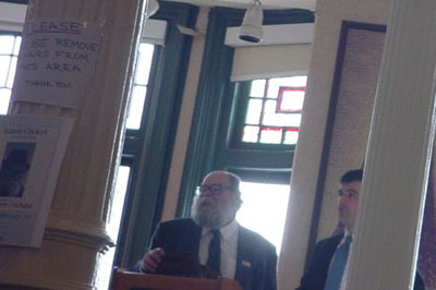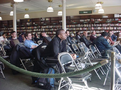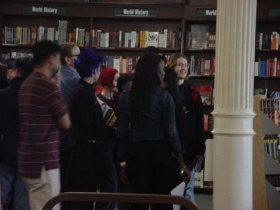 We had 11 undercover agents who were pre-planted in the seating area mixed in with around 40 actual Barnes and Noble customers. Agents Winckler and az3456 positioned themselves to covertly film the event, and Agent Dippold prepared to take digital photos. When everyone was in place, I quickly taped up one copy of our poster to the sign at the enterance of the area and another copy on the podium. I took the stage and gave a very brief introduction for Chekov. Led by the planted agents, the entire secton clapped as Chekov took the stage. Agent Wimpy spoke in a booming, charismatic Russian accent.