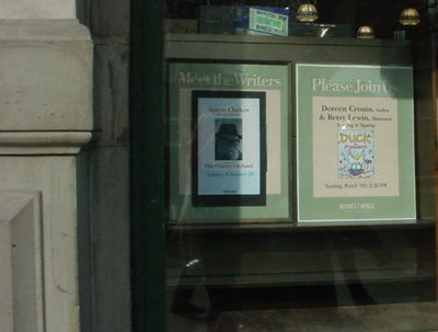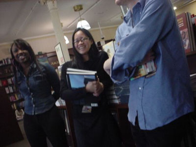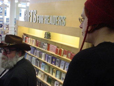 I played the part of an enthusiastic listener. When “Chekov” (Agent Wimpy) and his literary agent (Agent Todd) were escorted out by a Barnes & Noble employee and a security guard, I decided to stick around and get some audience reaction. It took only a few moments of looking around with a stunned and confused look upon my face before a woman sitting in the row in front of me engaged me in conversation.