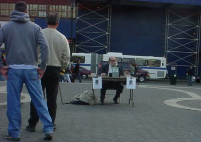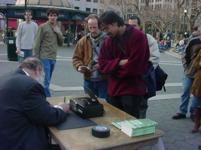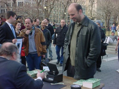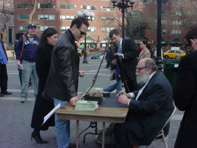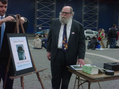 After the Barnes and Noble phase of the mission we regrouped at our meeting point and prepared for phase two. Agent Olsen had designed a second poster that read “Book Signing” rather than “Meet the Writers”. I had purchased 50 copies of one of Chekov’s most well-known plays, The Cherry Orchard, for $1.50 each. We set up a table at the south end of Union Square Park and Chekov signed and sold these books for $2 each.