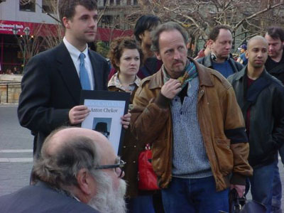 There were three basic categories of civilians in Union Square: those who didn’t know who Chekov was, those who did and believed he was sitting there, and those who knew who he was and knew this was a joke. But one particular old man was an intriguing combination. He knew quite a bit about Chekov, but didn’t seem to have any clue that what was transpiring was a joke. He took a lot of pride in trying to prove to anyone who would listen that Agent Wimpy was a fraud. He told anyone who would listen how Chekov died in 1904, how Chekov was 44 when he passed on, how Chekov would never be that animated, all with this smug smile on his face tat seemed to say “I know you’re a fraud, but I bet all these people believe you, and I’m going to be their hero and show them the light.