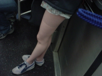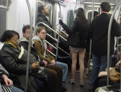Doors slide shut, train pulls out of the station, I grab onto a pole (though avoiding direct hand-to-pole contact, because I have a subway phobia that prevents me from touching things, which is a different, and more neurotic, story). It’s pretty crowded, so I just kind of cast my eyes downward. And there, next to me, is another pair of bare legs. A woman this time, with a courdouroy jacket, an ample bottom, and a pair of boy shorts. I look around a bit more. There’s a man sitting across from me, splayed legs, coat, periwinkle boxer briefs. The more I look around, the more flesh I see. I whisper to August, “I think we’re in the no-pants car!” Further observation reveals the pasty white flesh of about ten people’s thighs.