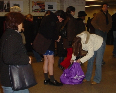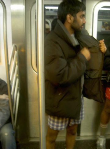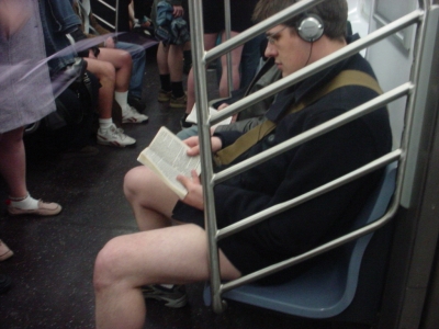 On the way back, when I first sat on the train (still with pants on) some guy started picking a fight with me. I was wearing headphones and zoning out, so I didn’t notice at first, which pissed him off more. Finally when I noticed he started like, “So what, you don’t even say excuse me? You just sit?” Apparently, when I brushed by him to sit behind where he was standing, he thought I was being rude. I’m a big pussy– I offered him the seat, and he was all, “No, I don’t want the seat. You just push me out the way like I’m not even there.” I apologized profusely, and finally he ended his barrage. Three stops later I was slated to take off my pants. I was scared to death. I felt like he would take that as the ultimate insult and start something. Luckily, a few people went before me, so he saw a couple of people taking off their pants. He had a quizzical look, but was clearly not amused.