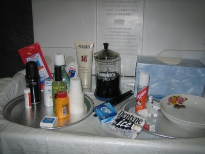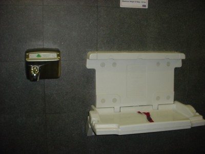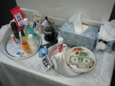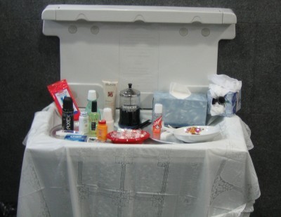 When the first wave of authority moved along we pounced. The various “agents” sprung into action and together we rigged the restroom with a camera and set up all of our attendant tools and goods on the diaper-changing table. In 3 minutes we were up and running and “open for business”.