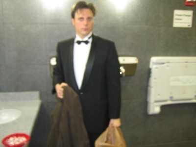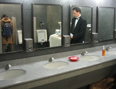And the people came. And they kept coming. English, Russian, Japanese, Korean, and New Jersey. Senior citizens and pre-pubescent boys. This was a blend I’d not yet contended with. These people had special needs. We only had hot water flowing from the taps as I feverishly distributed soap and towels. The room was hot. No real circulation flow. It felt like 90 degrees. And I was wearing a wool tuxedo. I couldn’t stop the perspiration.