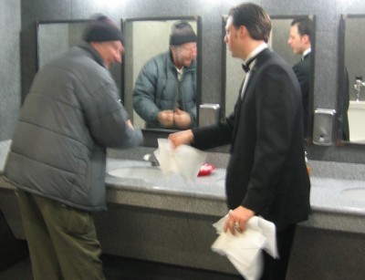 About a month ago, I was brainstorming a mission idea with a few friends called “Five Star Fast Food”. The idea was to deck out a fast food joint with all the trappings of a five star restaurant. There would be a Maitre D’ standing behind a podium asking for your reservation, a hostess to seat you, a waiter to take your order, and an attendant in the bathroom. The obvious problem with this idea is that it would very likely be shut down as soon as it begins. I decided to focus on the bathroom attendant aspect, figuring that we could last much longer in a secluded men’s room.