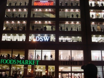 It was amazing how eye-catching her performance had been. I began to look at the building as a whole. The structure had been empty for years. I remember giving a Circle Line Tour of the area and announcing it “Prime Retail Space” as the For Sale banner hanging inside called it. In October of last year, the space was finally leased. Forever 21 (a woman’s clothing store), DSW (a shoe store), and Filene’s Basement (a discount department store) opened their doors for business in this 6 floor complex. On Wednesday, Whole Foods Market, the final store in the building, had its grand opening.