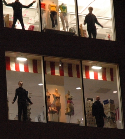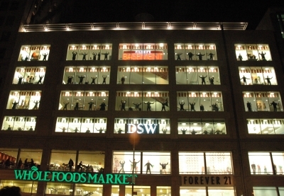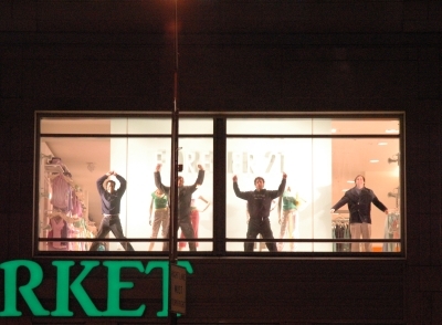 I was walking through Union Square a few months ago, and something caught my eye. In the window of the new retail store Forever 21, a girl was dancing with wild abandon. It was at night, and she was brightly lit standing next to the store’s mannequins. I stood and watched and laughed. Her behavior was unexplainable; a few minutes later her friend appeared from around the corner, and the two laughed and ran away. It had obviously been a dare.