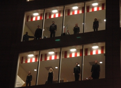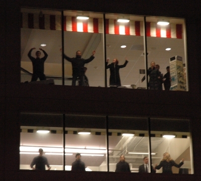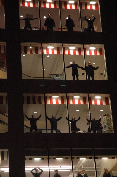 I was the first person to get a number, so I was way up in the corner at spot #1. As we made our way to the top we got several looks from employees who were watching more than a few people go through the building wearing all black. Once we got to the top though, things were a lot more lighthearted. The few employees there who took note first expressed their confusion (“Why are all those people looking outside?”), then, when things got going, they were all very amused (“They’re putting on a show! Only in NY!”). During the show, looking outside we saw many craned necks, arms and fingers pointing in our direction. A few cars driving by even stopped to see what the fuss was about. The whole event worked so well because of how well lit the entire building was. You could have made us out from the other side of the park. Finally, as we were leaving, many employees were huddled together discussing what just went on. A few suggested asking us, but none of them dared. It was a fantastically fun mission for me.