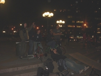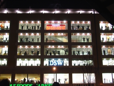 We headed up the escalator of Filene’s Basement by the truck load. The downward escalator was completely empty, so I figured we had the place to ourselves. I was pretty much right. There were more of us than there were customers. I browsed through chocolates and pillow cases, and then casually strolled to my window. I was situated in the #2 slot, on the top floor in the far left corner. The view was awesome. I looked down on Union Square, having no idea how many others were in place. I could, however, see we were drawing a crowd. Literally every person in the general vicinity of Union Square was staring up, with the exception of a few freestyle bikers. The bikers were doing some amazing tricks, which was a testament to our awesomeness. The people in Union Square weren’t watching the bikers and their double bunny lemon belly 720 jump flips. The people in Union Square were watching us. We weren’t even doing anything, just standing there.