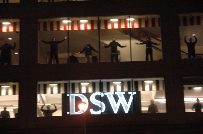 2) Ever thought about having a quick hit back at DSW… say, a flash mob attack of 75 folks spontaneously doing jumping jacks for 60 seconds, then dispersing?