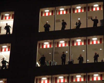 I was on the 6th floor on window 9 and it seems like lot of people down in the park were watching and from there reactions I could tell that we all together and doing the same number every time.