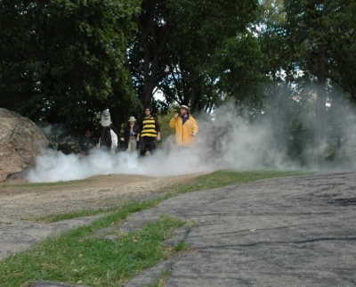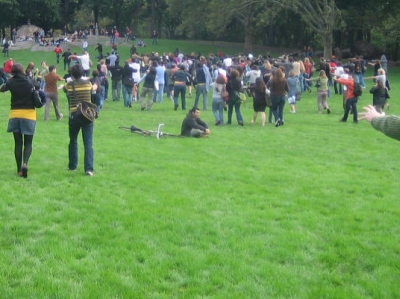 I was a bit concerned that attendance would suffer due to the last-minute change of date. As I waited behind the rocks with the rest of the cast, we sneaked peeks at the field in front of us. At 2:45, it didn’t look good. Not too many people out there, or so it seemed. Even by 3:00, it didn’t look like there were that many people out there. I suited up, and started my player like everyone else. From where I was, I could see few people participating, maybe 15 or so. It was great to see people in the middle of Sheep Meadow uninhibitedly bustin’ moves to Young M.C. When the zombie walk began, it was clear to me that this thing was going to work out. I got in line to make my entrance, and Agent Berrebbi hit the fog, which much to my surprise actually worked. When I rounded the rock, I was shocked to see probably 200 people gathered in front, cheering. It was truly amazing to see all those unfamiliar smiles.