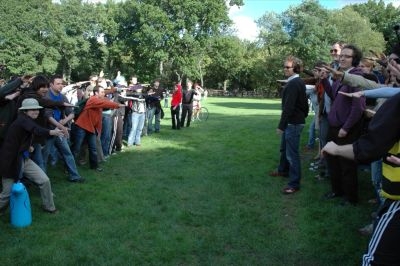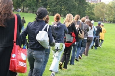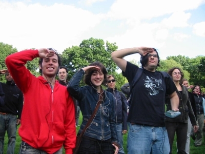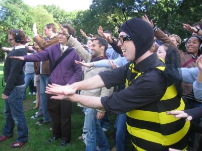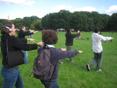 Very nice job, awesome day. It was like one big get-to-know-each-other (slash) warm-up exercise. I met some great people during the event and hung out with them afterwards. The moment I knew it was going to be special was when all the participants stood up in unison and we finally got to see how many people were in on it—and not just sitting in pairs with IPods ready, I guess. So thanks for the lovely day, it all fell together nicely—the music/voice-overs, activities, location, weather, everything.