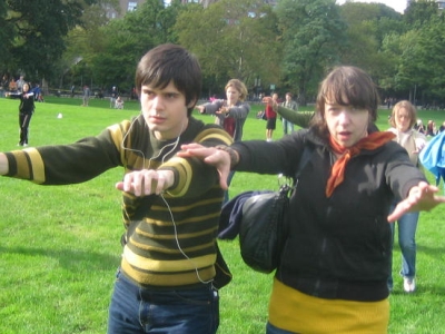 i’m just going to go ahead and display the full extent of my nerdiness, here, because the mp3 experiment [version 2.0] was so damn life-affirming i wanted to cry. here we were, a couple hundred strangers in the middle of central park, dancing to music no one could hear, zombie-walking towards unsuspecting bystanders, buzzing around and backstroking and just being completely silly. remarkably, no one questioned any instructions they were given or hesitated for a single second, because everyone knew this was just so well-intentioned. as one of the shyest, most awkward people IN HISTORY, it was pretty amazing for me, personally, to not feel any sort of uncertainty about doing the most random things in front of the most random people [maybe i need steve to guide me in my everyday life]. everyone totally just committed to this funny experiment and were a mess of laughter and smiles.