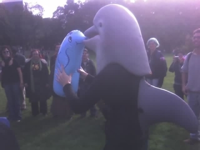 Right about when the dolphin group was finished swimming, I hit a button on my Mp3 player accidentally and started the track again. The iPod Shuffle I was using has no screen, so I had to try and fast-forward to about where we were, lest I ruin the experience for 25% of the people participating. Of course, I didn’t even come close and just had to fake the whole thing. I put on my mask at what I thought would be the right time. When the people started circling around me, I pulled out the dolphin from under the blanket. I believe I anticipated the shots a little too early, but I think the “Don’t mess with Debbie!” was pretty much right on time. I had a bunch of little plastic crystal dolphins in my front pocket that some people took, others neglected, I believe because of the lack of time and the fact that the dolphins were pretty close to my junk while I was lying on the ground. The leftover dolphins were donated to my wife’s third-grade students in Harlem. Maybe I.E. can use it as a tax write-off.