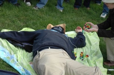 My mom brought me along on the experiment. It was my first mission ever. Usually I get upset when groups of people do something in unison, like clapping or dancing in an elevator. Now I know how to clap and I love resting on my mom’s hip when she dances, so I really enjoyed the intial part of the experiment in which we danced. I could feel how happy my mom felt in her heart to be dancing in the park with strangers on a perfectly gorgeous sunday afternoon, and it made me happy too. I have a rocket ship and stars on the wall next to my bed, so I was psyched that we were on the astronaut’s team. I hope when I am older that I will be proud to be an american. Right now I don’t really understand what that means, but I like the stars and stripes. The flag tastes good too, which I discovered later in the afternoon. I found the paper, scissor, rock part a little confusing, but the beach ball tossing was a blast. I am still playing with the balls at home. Ball was my first word. I’m really into them.