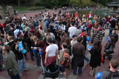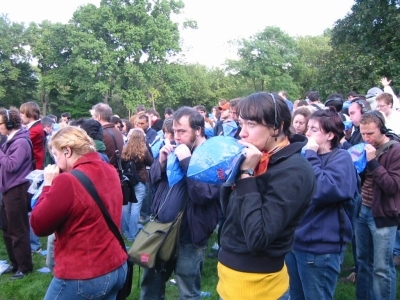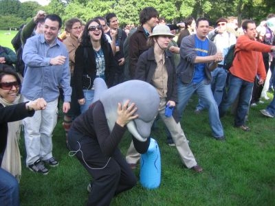 The MP3 Experiment 2.0 was amazing. It was really a transcendent experience. It was so cool sitting on the lawn and standing up when the track told us to, and seeing TONS of other people stand up and look around at all the participants. The end part where we hit beach balls around to The Polyphonic Spree song felt like being in some dream. It was a great moment that I never would of thought of and it was cool to look around and think, "Whoa this is really happening!". It was like being in a movie.