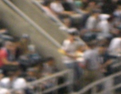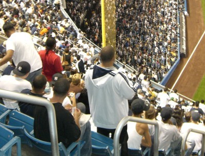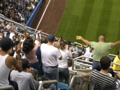 There was only one way to heighten the opposite-field upper-deck wandering: a front row sighting by the Yankee dugout. This would be tough since the area is heavily guarded by ushers and the rows are even chained off to those without proper tickets. But once I made my way to the lower level, I waited until a Yankee rally ended and more importantly until a vendor undid the chain to the aisle and followed closely behind him. I slowly tiptoed toward the Yankee dugout and falsely glanced around for my seat. For a brief second I peeked up to the upper deck and out of the corner of my eye I could see hundreds of tiny arms waving around in my direction. Off in the distance I could faintly hear the chant: “Rob’s retarded!” (CLAP-CLAP, CLAP-CLAP-CLAP) All was well.