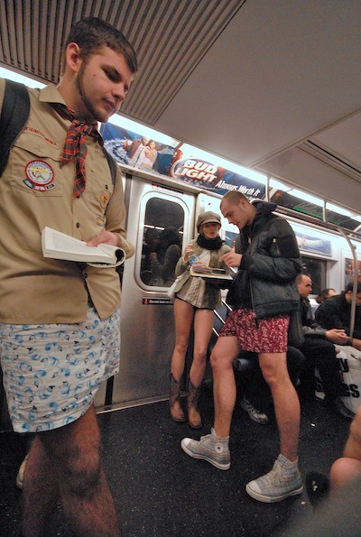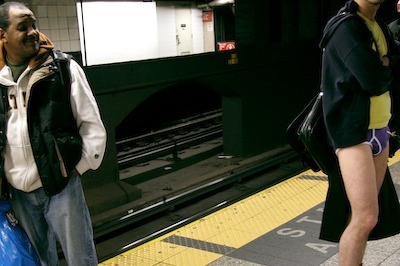 The ride up, for me, wasn’t too crazy. I was to depants at Union Square, and I stood up a stop before mine to prepare. An older black man had taken my seat, and I was still standing right there, so when I leaned over to take my pants off, as did several other people in my car, he just started saying, "What? WHAT?!" Highly entertaining.