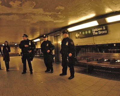 There was a group all dancing and singing around a street performer. then the chant for him to get his pants off. There was also a cop but he was cool and was more concerned with people standing on the yellow safety strip getting to close and falling onto the tracks.
