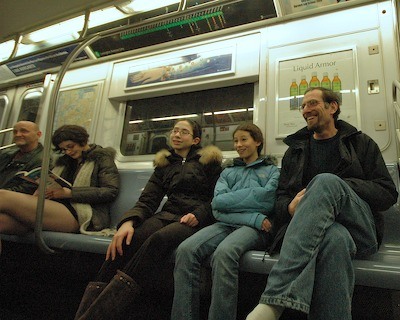 I think I made a mistake as I entered the other train because I was still in character as a regular subway rider and instead of standing so I could hear the effect of our pantslessness on other riders, I immediately chose one of the "jump seats" near the door–because that’s what I always do when I get on the subway and that seat is open. So as the train slowly filled, I didn’t get to hear any choice remarks, except for that of a Midwestern couple, and then later a chick who expressed much confusion.