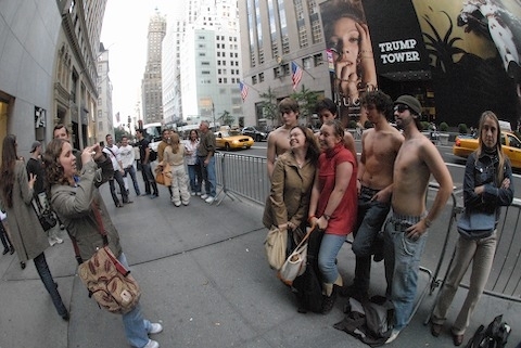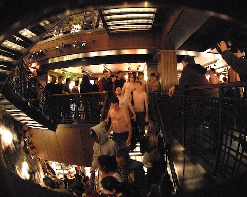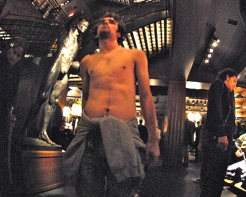 After the photo shoot, we regrouped and got organized for the mission. There are four floors in the Abercrombie, so I divided everyone up into four groups by birthday month, to ensure we’d have an even number of men on each floor. Those on the second floor were out of luck, as they’d be shopping on the women’s only floor. I instructed them to claim to be shopping for their girlfriend. I then divided the group up by birthday year and had them enter the store at staggered times, to prevent an obvious line forming at the entrance. At exactly 4:37 everyone was to discreetly remove their shirt on their assigned floor and hide it in their pocket or pants. (We figured that if we had 100 people trying to enter the store shirtless, they’d probably stop letting us in after the first 20 or so slipped by.)