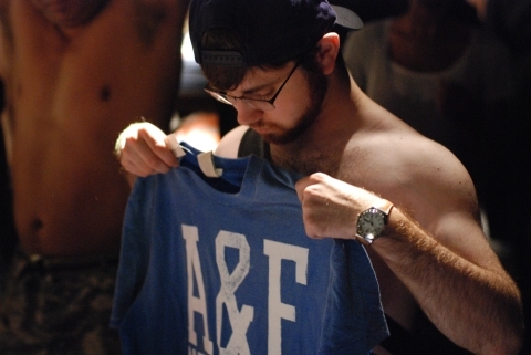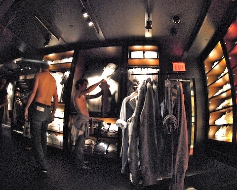 Abercrombie’s hired modelAgent Nguyen came up with the idea for this mission when he noticed the 5th Avenue Abercrombie and Fitch store had a shirtless male model greeting all customers as they enter. Upon further examination, we discovered the model is only one aspect of the store’s celebration of the shirtless male. There are photographs all over the store of bare-chested men, both on the wall and on the products themselves.