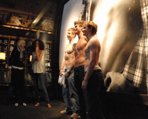 After about 15 minutes, the Abercrombie management decided it was time to kick us out. Security employees started approaching all of our men and asking them to either put a shirt on or leave. They informed us that the model was a paid employee and his state of undress didn’t justify ours. So despite the fact that the store constantly bombards you with the image of the shirtless male, Abercrombie still maintains a “No Shirts; No Service” policy. Some agents protested that they were trying to