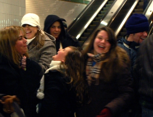 Tourists laughing at the Times Square station