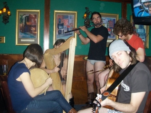 An entire pantless band, including the aforementioned harpist, performing
