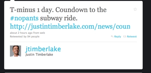 My god, two tweets? No-Pants is certainly getting big. Lady GaGa would be proud of her fellow New Yorkers.