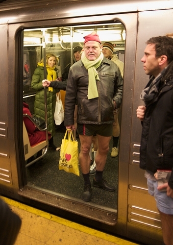 While we were having our fun in New York, No Pants Subway (or Light Rail or Bus) Rides were also happening in 43 other cities in 16 different countries. I uploaded a highlight photo of each regional ride to flickr. Justine Bateman appears in the Los Angeles photo. I think that makes her our first celebrity No Pants participant, though several past participants have gone on to television fame. Their faces in photos of past years are like Easter eggs now. Anyway, it’s fun to see photos from people doing the same silly thing all over the world: