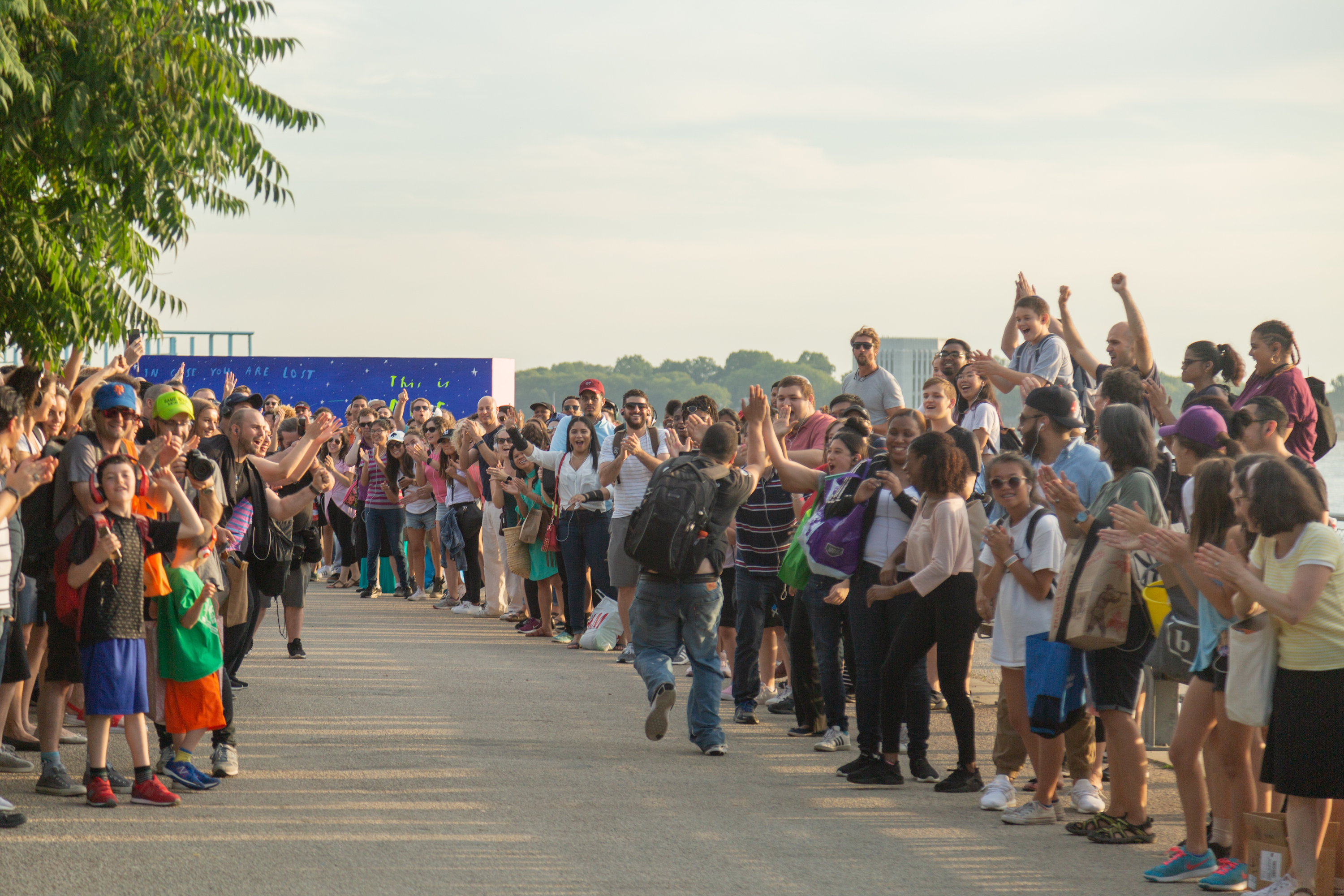 Participants form long lines on either side of the two main jogging paths in the park, creating a race by cheering on random runners and cyclists.