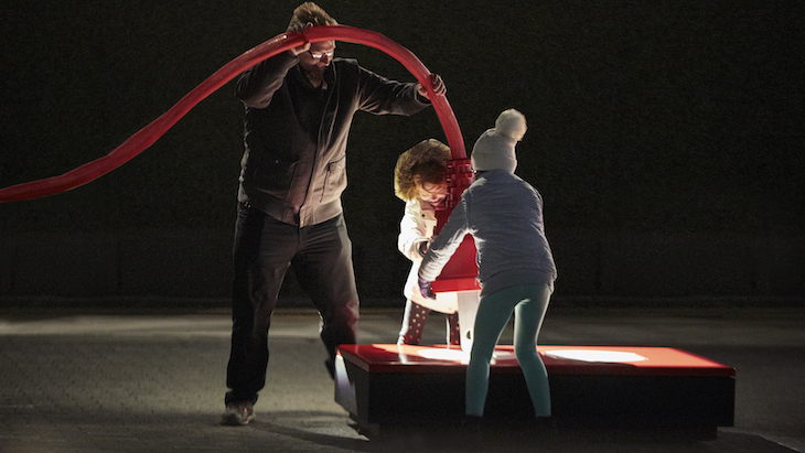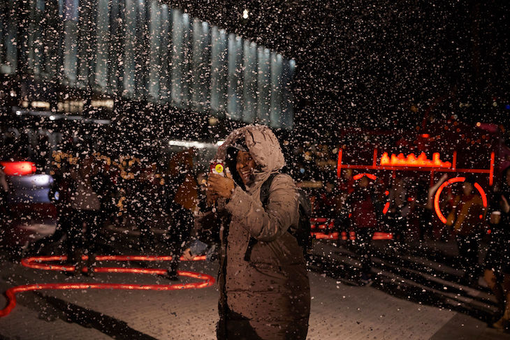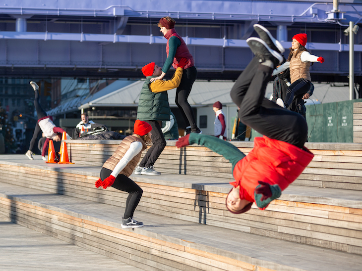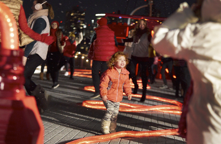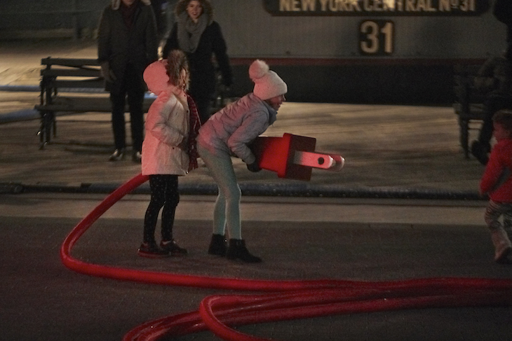 For our latest mission, we placed a 10-foot tall boombox on Pier 17 in Manhattan and waited for unsuspecting people to plug it in. Real New Yorkers worked together to carry the 160-foot long cord across the pier to an oversized outlet. Once the boombox was plugged in, everyone was surprised by a massive holiday dance party with 100 acrobatic dancers, thousands of Christmas lights placed on two historic ships, and 10 hidden snow machines. This project was made possible by Target, and it is our third holiday collaboration with them after 2015’s The Light Switch and 2014’s Epic Christmas Caroling.