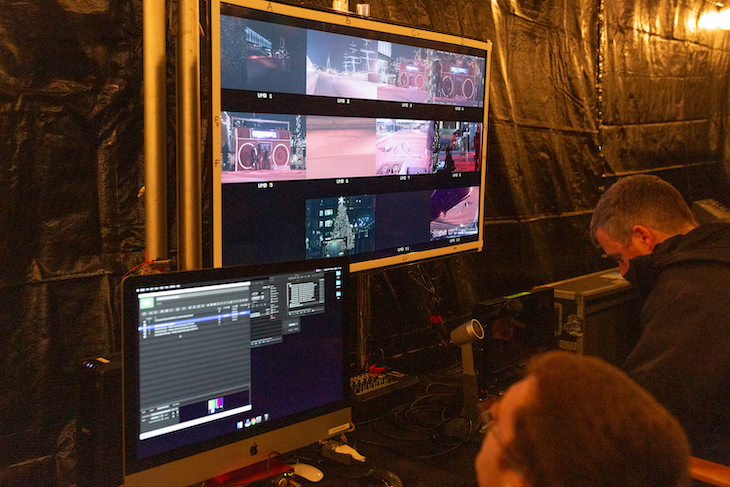 Producer and Director of Photography Justin Ayers works inside the boombox. The boombox has a sound system and LED screen built in.